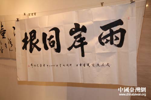 北京著名書法家韓鐵成在現場寫下了“兩岸同根”四個大字,他說,兩岸文化同根同源,書法尤其如此,兩岸同胞應該攜起手來共同傳承和發展書畫藝術。