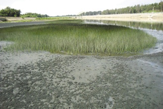 高美濕地瀕臨絕種的云林莞草遭重油污染,綠草染黑,大地變色。圖片來源:臺灣《聯合報》