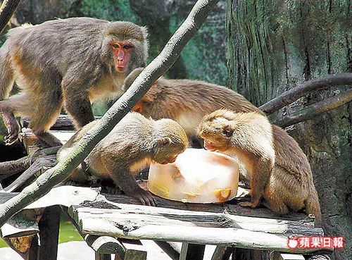 臺(tái)北市動(dòng)物園提供冰品讓臺(tái)灣獼猴消暑。圖片來(lái)源:臺(tái)灣《蘋果日?qǐng)?bào)》