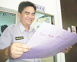 宜蘭縣警員看到學生們寫得滿滿的“感謝卡”非常感動。圖片來源:臺灣《中國時報》