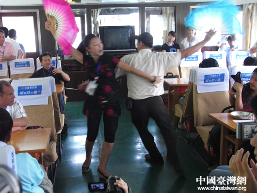 桂林市文化局在船上為臺灣嘉賓們準備了具有地方特色的節目,而臺灣嘉賓也不甘示弱,與桂林的藝術家輪流上場,于是在漓江上演了一場兩岸文化界人士的聯歡。