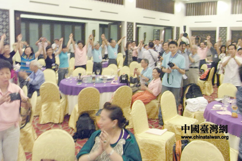 聯歡會結束時,臺上臺下所有嘉賓一齊手拉手,唱起“劉三姐”中的山歌:多謝你。全場沉浸在一片歡樂的海洋中。 (中國臺灣網 蕪同 攝)