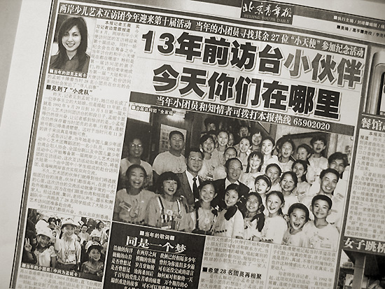 那是在2005年5月下旬的一天,辦公室有人在說,有個小天使在報上尋找當年的小伙伴,名叫“莫尼卡”。我很驚詫這個名字很像蘇聯姑娘,更對這件事產生了興趣。迫不及待地找來了那份《北京青年報》,果然看到了那則特殊的“尋人啟事”,確切地說,那是記者的一份采訪報道,題目是《13年前訪臺的小伙伴,今天你們在哪里?》內容正是第一屆大陸和平小天使孟妮卡在尋找當年的小伙伴。那時,我已經離開了供職近20年的雜志社,調到新的部門工作,而恰巧的是,這個部門正在籌備迎接臺灣第十屆和平小天使的訪問。