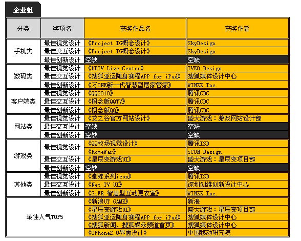 令人期待已久的首屆海峽兩岸互動數字內容設計大賽之 Digital UI優秀用戶界面設計大賽,經過緊張激烈的評分,獲獎名單也終于出爐。據了解,本次 Digital UI優秀用戶界面設計大賽共征集到200件作品,其中有84件入圍決賽,最終共產生40個獎項(企業組20個,個人組20個),空缺獎項8個。從獲獎結果可以發現,騰訊、盛大游戲、新浪、搜狐等企業摘取了大賽多個最佳獎項的桂冠。業者認為,UI設計是人機結合的表現形式,是用戶與產品產生交互的載體,從騰訊等包攬多個獎項說明這些企業本身實力非凡,同時這也是這些企業自身重視用戶體驗和產品結合的結果。