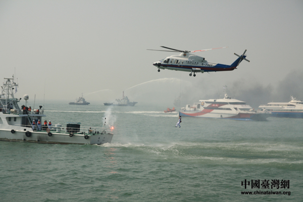隨后,參加演練的海峽兩岸船舶和救助直升機集結編隊,緩緩通過指揮觀禮臺,進行海峽兩岸海上搜救力量展示,體現了海峽兩岸搜救協作的互動與協作又邁出了可喜的一步,進入了全面合作、共同維護臺灣海峽海上交通安全的歷史性新時期。