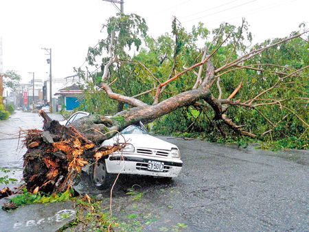 “凡亞比”臺風(fēng)威力驚人,將路樹連根拔起,壓毀停在一旁的車輛,幸無人傷亡。來源:臺灣《中國時報》