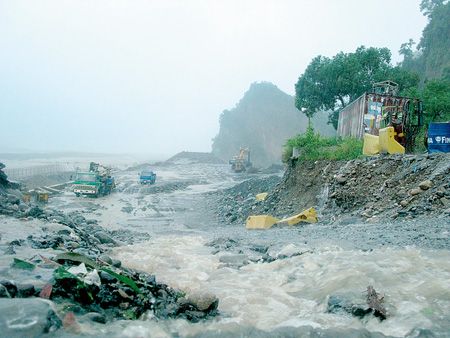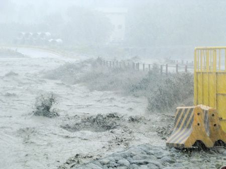 高雄縣荖濃溪水暴漲,湍急溪水漫過六龜大橋便道,無法通行。來源:臺灣《中國時報》