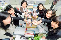網絡團購在臺灣蔚為風尚,圖為一家臺灣企業(yè)的員工們開心地展示團購戰(zhàn)利品。來源:臺灣《中國時報》