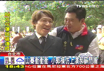 據(jù)報(bào)道,臺(tái)灣模仿天王郭子乾昨(17)日為息影從政的好友、新黨參選人侯冠群站臺(tái),郝龍斌也首次跨黨輔選來(lái)到現(xiàn)場(chǎng),卻碰到郭子乾這樣的“不速之客”。郭子乾極盡搞笑之能,模仿蘇貞昌的表情聲音表示,“郝市長(zhǎng),怎么看我是很深的眼神,不要這樣看我啦,我誤會(huì)你花博了啦”,“我如果不幫我自己也講不過(guò)去,我們一起競(jìng)爭(zhēng)啦,但是好像你民調(diào)又贏(yíng)我啦”,惟妙惟肖的模仿差點(diǎn)真讓郝龍斌以為蘇貞昌在臺(tái)上,他對(duì)郭子乾表示非常感謝。