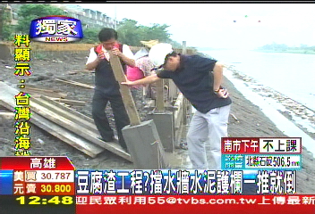 中國臺灣網10月22日消息 據臺灣TVBS電視臺報道,臺風“鲇魚”使得在919水災中受淹最嚴重的高雄市民再次神經繃緊。今日下午,高雄市楠梓地區里長向高雄市政府提出抗議,他表示高雄市后勁溪擋水墻工程是“豆腐渣工程”,用2根手指就可以推到,若臺風“鲇魚”來襲,后果不堪設想。