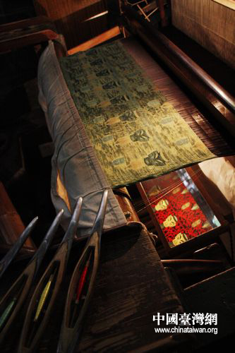 蜀錦織工工作位。錦下方的鏡子可以反映出正面圖案。(中國臺(tái)灣網(wǎng) 馬迪 攝)