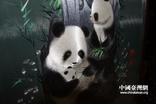 蜀江錦院中也陳列眾多蜀繡精品。圖為大小熊貓坐屏,繡工精美,纖毫畢現(xiàn)。(中國臺(tái)灣網(wǎng) 馬迪 攝)