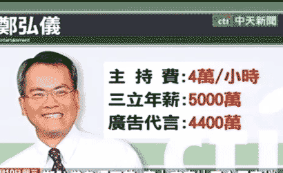 據報道,作為臺灣三立電視臺的招牌主持人,鄭弘儀的收入頗豐。他在臺灣三立電視臺的純年薪為5000萬元,主持節目另算,每小時為4萬元。加上每年4000萬的廣告費,鄭弘儀的收入逼近億元大關。
