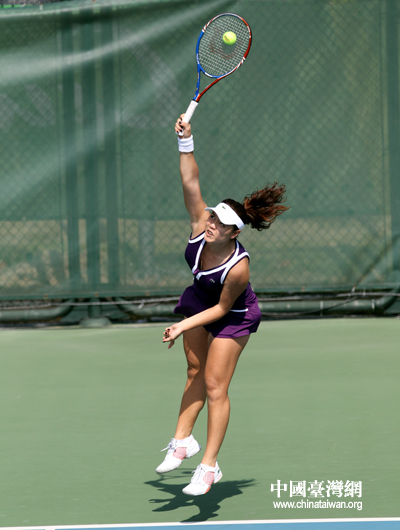 中華臺北隊女網(wǎng)選手張凱貞發(fā)球瞬間。(中國臺灣網(wǎng) 鐘寶華 攝)