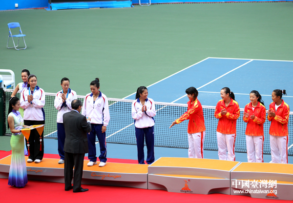 中國臺灣網11月16日廣州消息 第十六屆廣州亞運會女子網球團體賽決賽,雖然中華臺北隊不敵中國隊,獲得銀牌,但在頒獎儀式上,兩岸女網金花們卻十分輕松,交流不斷。(記者 鐘寶華)