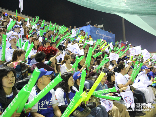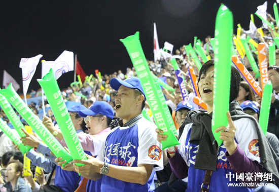 中國臺灣網(wǎng)11月19日廣州消息 中華臺北隊(duì)今晚與韓國隊(duì)在棒球場上二度決戰(zhàn),衛(wèi)冕冠軍與傳統(tǒng)勁旅的亞運(yùn)金牌之爭吸引了大批觀眾到場,看臺上座無虛席,不但有數(shù)百名臺灣球迷特意從島內(nèi)趕來加油助威,更有大陸觀眾提前三個小時進(jìn)場,為臺灣健兒打氣。