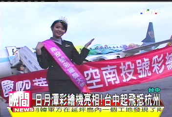 彩繪機為編號B16829,首航地點選在清泉崗機場舉行,自臺中起飛、首飛杭州,是南投縣政府籌備一年多的成果。一位高挑的美女代言人、通過網絡票選出來的彩繪機大使也跟著亮相,她本身也是一位空服員。她強調要用微笑和親切服務,讓外界對于彩繪機留下深刻印象。(中國臺灣網 馮江)