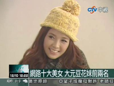 據報道,臺灣網絡知名部落格公布今年人氣最旺的正妹型男排行榜,《大學生了沒》節目固定班底的大元,以自然甜美的模樣,被封為新一代的網絡甜美女神,部落格人氣直沖700多萬,獲得正妹排行第一名。