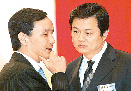 臺(tái)北縣長(zhǎng)周錫瑋(右)以準(zhǔn)“過來(lái)人”經(jīng)驗(yàn)斷言,臺(tái)中、臺(tái)南、高雄三市至少會(huì)亂一年,新北市由于已有磨合經(jīng)驗(yàn),市長(zhǎng)朱立倫會(huì)比較平順。圖片來(lái)源:臺(tái)灣《中國(guó)時(shí)報(bào)》