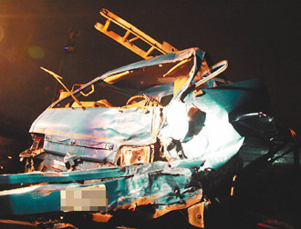 藍色貨車昨晚在新城鄉七星潭德燕漁場旁路旁,與載有10名陸客團的游覽車對撞,車頭嚴重變形。 圖片來源:臺灣《聯合報》