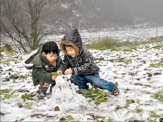 宜蘭縣與臺中縣交界的思源埡口難得降雪,孩子們開心地堆雪人。圖片來自網絡