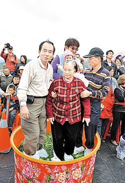 黃玉振、苗栗縣長劉政鴻、“立委”徐耀昌和許多政要也體驗(yàn)了踩咸菜樂趣,還有老外湊熱鬧。不過,最受矚目的是羅湯月妹老太太家族15人,老太太帶了開客家美食餐廳的兒子羅俊森、孫子和半歲大的曾孫女羅致瑜,四代同堂一起踩咸菜。