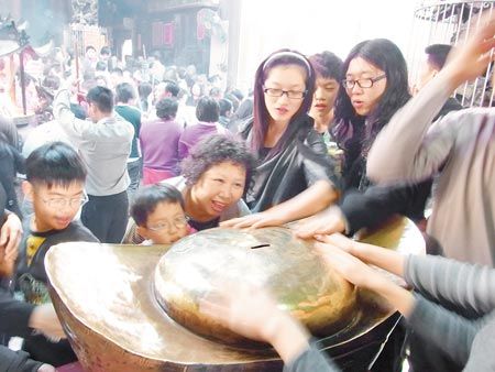 云林北港武德宮財神爺廟涌進大批人潮,大家爭相撫摸鎮殿大元寶,希望財運亨通。 來源:臺灣《中國時報》