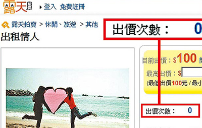 有網(wǎng)友在拍賣網(wǎng)站以100元起標,在情人節(jié)當(dāng)天拍賣自己充當(dāng)情人,但無人出價(紅框處)。來源:臺灣媒體