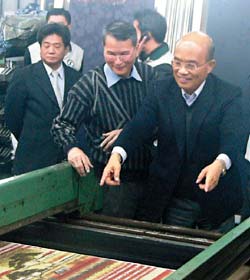 蘇貞昌(右)昨日參觀新北市印染廠,至于是否投入2012“大選”,他首度松口表示“正認(rèn)真考慮中”。圖片來源:臺灣《聯(lián)合報》