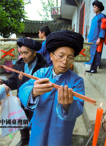 押禮先生手拈檀香拜祭祖靈,袖戴帶紅花的新郎在臺(tái)階上等候。(中國(guó)臺(tái)灣網(wǎng) 陳佳慧 攝)