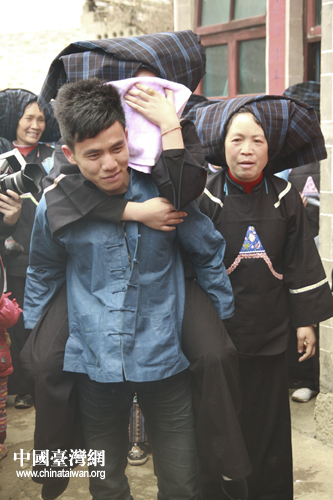 新娘由弟弟背著離開閨房,她用布巾蒙臉,痛哭著走向花轎。(中國臺灣網 陳佳慧 攝)