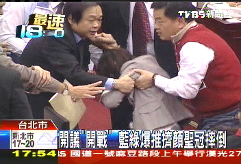 報道稱,藍綠議員在議場中間拳腳相向,推來擠去,場面像在打軟式橄欖球。沖突中,民進黨議員顏圣冠倒退時摔倒,臉頰被一旁麥克風劃傷。