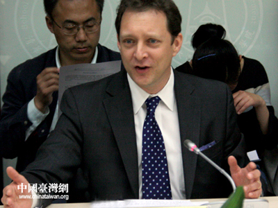 《大陸和臺灣經濟互相開放的影響》作者之一的榮大聶(Daniel H.Rosen)在座談會上發言。(中國臺灣網 高斯斯 攝)
