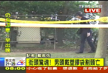 中國臺灣網4月21日消息 據臺灣TVBS電視臺報道,臺北市鬧區街頭今(21)日早上傳出離奇死亡案件。在臺北市敦化南路遠企大樓前方的安全島,發現有一名男子倒臥在電箱旁,頭上戴有塑料袋,脖子上有明顯割痕。