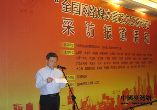 4月22日,“全國網絡媒體重返災區看奇跡”采訪報道活動在成都啟動,四川省網管辦副主任陶俊培主持啟動儀式。(中國臺灣網 朱毅 攝)