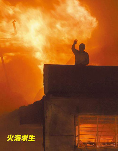 一名男子受困頂樓,顧不得濃煙嗆人,向警消揮手求救。圖片來自網(wǎng)絡