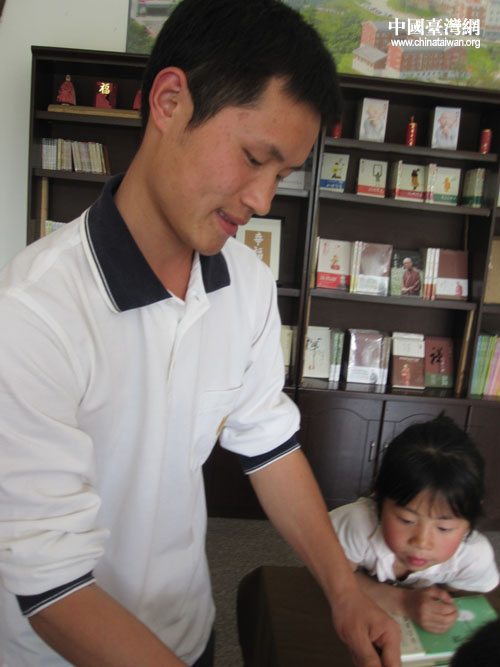 什邡安心站的志愿者鄧兵向記者介紹法鼓山援助四川重建情況。(中國臺灣網 朱毅 攝)