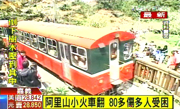 中國臺灣網4月27日消息 據臺灣“中央社”報道,27日中午,阿里山森林小火車行駛在阿木站至阿里山車站70公里處,因發生意外翻車。據稱目前已有20多人因事故受傷,臺灣方面正在緊急搶救當中。(中國臺灣網 芮益芳)
