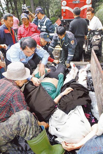 魂斷異鄉,因傷亡人數眾多,救難人員臨時用臺車充當擔架,將罹難者運送下山。圖片來源:臺灣媒體