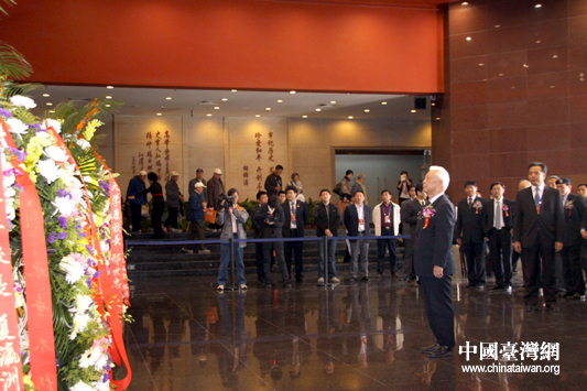 座談開始前,與會人士在中國人民抗日戰(zhàn)爭紀(jì)念館大廳雕像前,向抗日英烈進(jìn)獻(xiàn)花籃并三鞠躬,表達(dá)緬懷與追思。(中國臺灣網(wǎng) 普燕 攝)