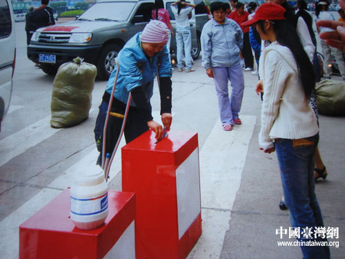 地震發生后,殘障人士拄著拐杖來奉獻愛心,翻拍自陳列館圖片。(中國臺灣網 朱毅 攝)