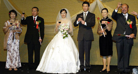 2007年1月,蔡冠倫兒子與侯孝賢女兒結婚,侯孝賢夫婦(左起)與女兒侯蘊華、女婿蔡君飛、親家蔡冠倫夫婦向賓客敬酒。資料圖