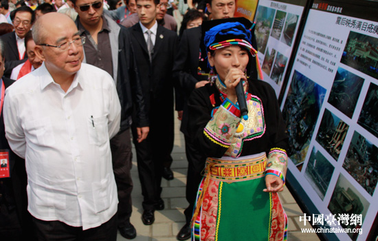 今日上午,國民黨榮譽主席吳伯雄率領(lǐng)前來參加兩岸經(jīng)貿(mào)文化論壇的百余臺灣嘉賓前往汶川映秀鎮(zhèn)、水磨鎮(zhèn)考察災(zāi)后重建情況。圖為吳伯雄參訪水磨鎮(zhèn)并聽取相關(guān)人員介紹災(zāi)后重建情況。(中國臺灣網(wǎng) 高斯斯 攝)