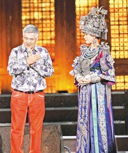 趙本山(左)演唱會上意外上場,逗樂宋祖英與臺下粉絲。圖片來源:臺灣《中國時報》