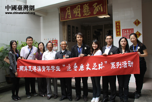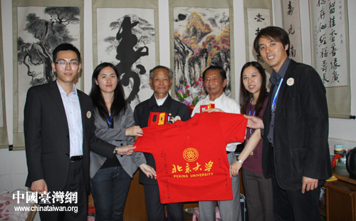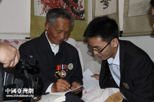 盧彩文老兵在王正所攜帶的《中國遠征軍》一書上簽名(中國臺灣網 楊永青 攝) 王正為盧彩文老兵佩戴“追尋歷史足跡”活動的徽章(中國臺灣網 楊永青 攝) 盧彩文、邵應壬老兵與四位臺籍學生合影(中國臺灣網 楊永青 攝) 盧彩文、邵應壬老兵二人感情深厚,接受記者采訪時亦親密搭肩。(中國臺灣網 楊永青 攝) 同學們在邵應壬老兵家的院子里合影(中國臺灣網 楊永青 攝)