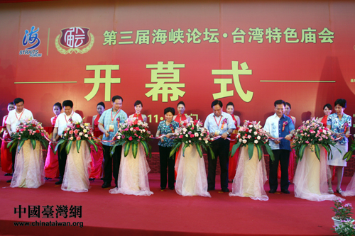 第三屆海峽論壇重要活動之一的臺灣特色廟會今天下午舉行開幕式。圖為參加活動領(lǐng)導為開幕式剪彩。(中國臺灣網(wǎng) 于斯文 攝)
