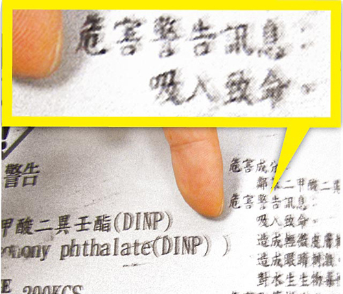 塑化劑(DINP)桶身貼的警告標志,在危害成分注明:“吸入致命”(黃框處)。圖片來源:臺灣媒體