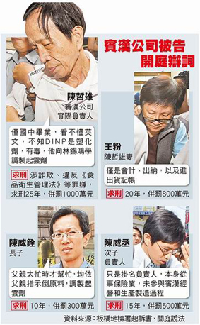 板橋地方法院5日首次開庭,陳哲雄(67歲)、王粉(59歲)辯說:“DINP對他們來說,僅是個名稱,不知是塑化劑。”賓漢從1996年就跟興隆貿易購買DINP,并由廠長林錫鴻制造起云劑,而陳哲雄是跟林錫鴻學的技術,2005年接手賓漢,也沿用過往作法。