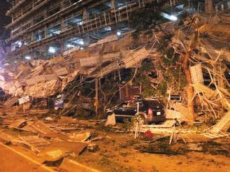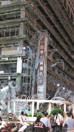 臺中市金典酒店正在改建,昨天傍晚10層高的施工鷹架突然倒塌,路人驚嚇奔逃,12人受傷。圖片來源:臺灣《聯合報》