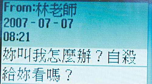 林定玉傳短信給女方“我怎么辦?自殺給你看嗎?”圖片來源:臺灣媒體